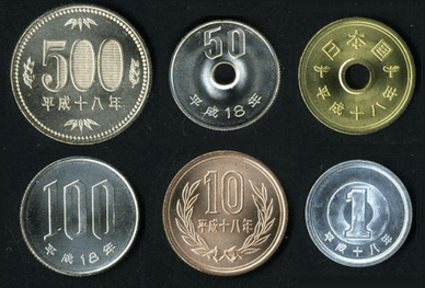 Münzen sind in Japan wesentlich weiter verbreitet. Es gibt kleine und große Stückelungen: 1, 5, 10, 50, 100 und 500 ¥. Die 5 und 50 Yen haben ein Loch in der Mitte.