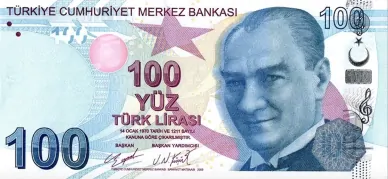 - 100 TRY ist eine blaue Banknote im Format 154 × 72 mm. Die Rückseite zeigt den Musiker Buhurizade Itri, Musiknoten, Instrumente und eine Mevlevi-Figur;