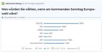Diese Prognose wird durch die Sonntagsfragen bestätigt. Die Webseite Wahlrecht.de, die diese und andere Wahlumfragen sammelt, zeigt, dass die AfD unter den Befragten einen stabilen Anteil von 14–20 % an Anhängern hat und trotz der engen Konkurrenz durch die SPD auf einem ziemlich starken zweiten Platz liegt.
