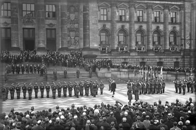 Der große Volkstrauertag am 13. März 1927 vor dem Reichstag fand unter reger Anteilnahme der Bevölkerung statt. Reichspräsident von Hindenburg schreitet die Front der Ehrenkompanie ab