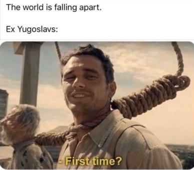 „Die Welt bricht zusammen“, heißt es in dem im Jahr 2020 beliebten Meme, das den Helden des Films „The Ballad of Buster Scruggs“ der Coen-Brüder zeigt. Der Mann ist der Videokamera zugewandt, sodass wir die Schlinge um seinen Hals sehen können. Die ganze Geschichte seiner Figur dreht sich um die Erhängung, die ganze Ironie der Episode ist in diesem Moment angelegt. Die Aufnahme wurde schnell Teil von Meme-Internetkultur, jeder sah dieses Bild, nur wenige sahen den Film selbst. „Die Welt bricht zusammen“, sagt der unbekannte Autor des Bildes und fügt dann die folgende Zeile hinzu: „Ex-Jugoslawen: Ist es nur das erste Mal?“.
