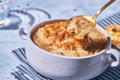 Klassisch französisch: goldbraune Zwiebelsuppe mit Käsekruste