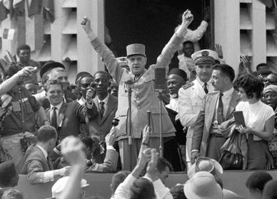 Charles de Gaulle delivering a speech in Brazzaville, then a part of French Equatorial Africa, in August 1958