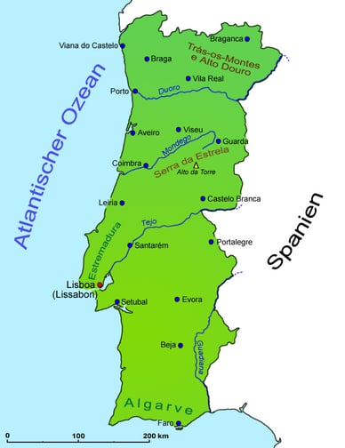 Portugal teilt sich die Iberische Halbinsel mit seinem einzigen Nachbarn Spanien. Das Land wird im Süden und Westen vom kühlen Wasser des Atlantiks umspült und bildet eine Halbenklave.