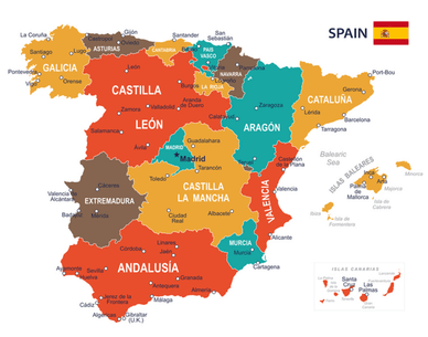 Das viertgrößte Land Europas nimmt fast die gesamte Iberische Halbinsel ein. Aber nicht nur hier liegen die Besitztümer Spaniens: Als Nachhall der glorreichen Zeiten der Macht des Madrider Königshofes besitzt es auch die Kanarischen und Balearen Inseln sowie zwei kleine souveräne Territorien im Norden des afrikanischen Kontinents – die Städte von Ceuta und Melilla.