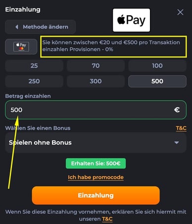 🤑 Maximaler Einzahlungsbetrag über Apple Pay | 500 € |