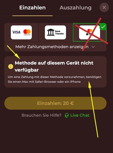Diese Zahlungsoption funktioniert ausschließlich auf iOS-Geräten, darunter iPhone, iPad, Watch und Mac mit Safari-Browser.