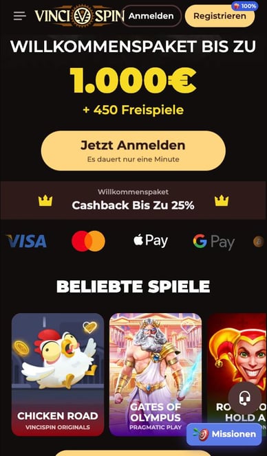 Es gibt nicht viele neue Spieleplattformen, die diese Zahlungsoption bereits unterstützen. Ein Beispiel aus der Bewertung ist Vinci Spin, das sie als Zahlungsmethode anbietet.