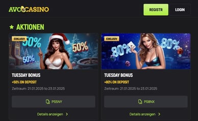 Avocado Casino bietet regelmäßigen Spielern dienstags einen exklusiven Bonus (50% oder 80% des Einzahlungsbetrags). Die Boni werden sehr oft aktualisiert und manchmal müssen Sie einen Promo-Code eingeben, um sie zu bekommen. Von Zeit zu Zeit hält Avo Casino Turniere für Spieler zusammen mit beliebten Softwarebetreibern.