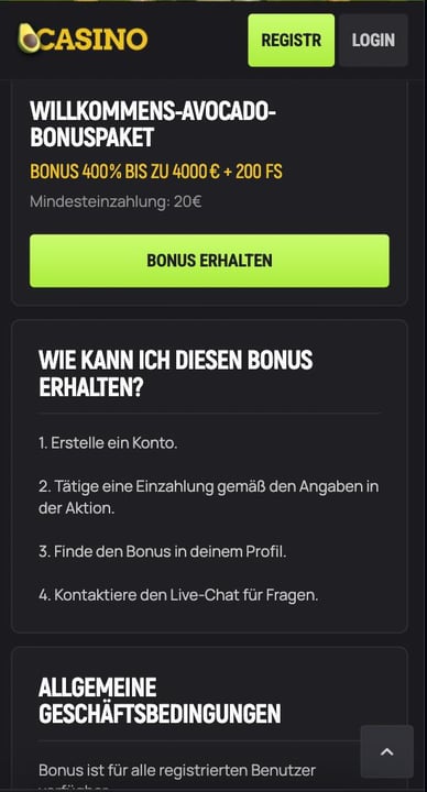 Das Willkommensbonusprogramm von AvoCasino bietet neuen Spielern einen starken Einstieg. Obwohl das Casino keinen Avocasino No Deposit Bonus anbietet, gibt es gleich zwei Willkommenspakete: bis zu 400% bonus bis zu 4000 € + 200 FS für Anfänger und ein VIP-Paket Bonus bis 600 % bis zu 8000 € + 400 Freispiele gratis für High Roller! Der Unterschied zwischen diesen Paketen ist ganz einfach: Beim VIP-Paket ist am Eingang ein größerer Einzahlungsbetrag erforderlich, aber ansonsten müssen Sie sich nur registrieren und eine Einzahlung tätigen, um einen Willkommensbonus zu erhalten!