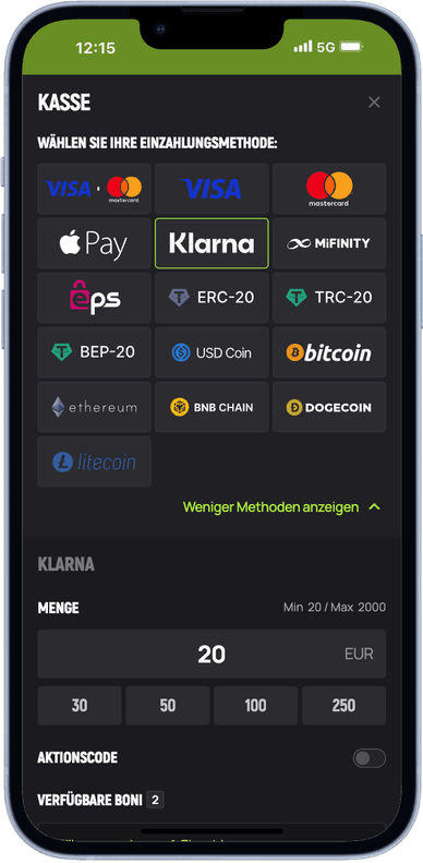 💸 Zahlungssysteme | Visa/Mastercard, Paysafe Card Casino, Mifinity, Casino mit Apple Pay, Sofort (Klarna) |