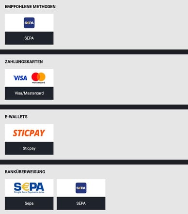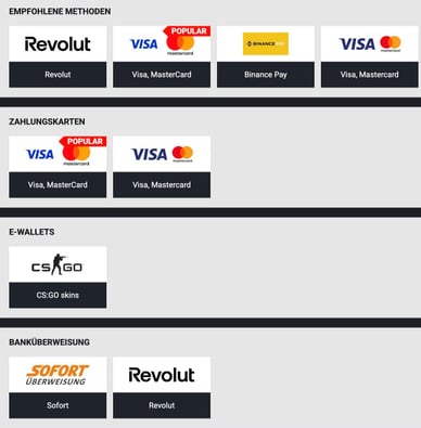 Nachfolgend finden Sie die auf der Website verfügbaren Zahlungsmethoden: