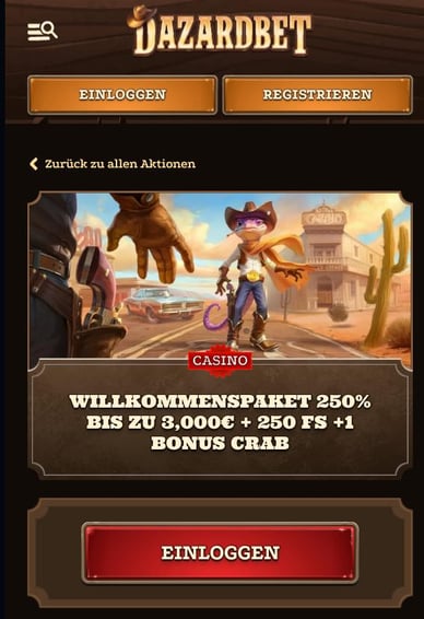 Es ist unmöglich, die Arbeit eines Casinos zu analysieren, ohne sein Bonussystem zu bewerten. Meine Aufmerksamkeit wurde auf den Registrierungsbonus gelenkt. Daran kann man schon erkennen, wie großzügig ein Casino ist. Bonus 250 % bis zu 3000 EUR + 250FS + 1 Bonuskrabbe – Willkommensbonus im Dazardbet Casino für die Registrierung eines Kontos. Um dieses Angebot zu erhalten, müssen Sie die folgenden Bedingungen erfüllen.