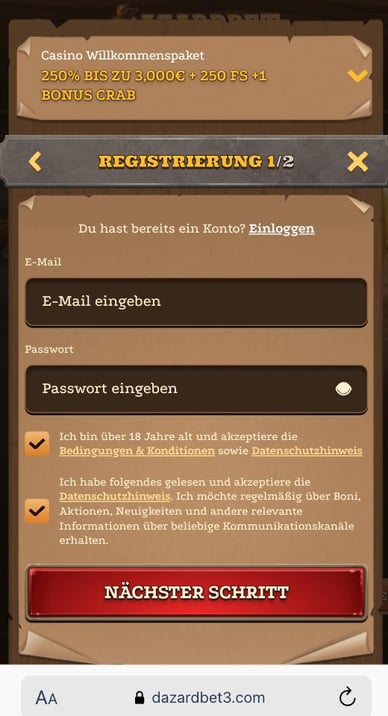 Die Einfachheit und Schnelligkeit des Zugangs zur Website haben einen großen Einfluss auf das Spielerlebnis des Benutzers. Der Vorteil von Dazard Bet Casino ist eine recht einfache Registrierung. Es besteht aus den folgenden Schritten.