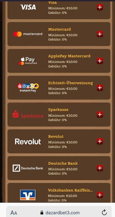 Neben den traditionellen Zahlungsmethoden unterstützt Dazardbet 3 auch Kryptowährungen. Dadurch wird die Bearbeitungszeit erheblich beschleunigt. Allerdings sollte bei der Verwendung dieser Zahlungsmittel immer die Volatilität beachtet werden.