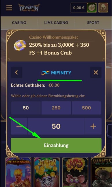 Ich erzähle Ihnen, wie ich mein Guthaben mit MiFinity aufgeladen habe. Anhand meiner Schritt-für-Schritt-Beschreibung der Zahlung wird der gesamte Vorgang einer Einzahlung in Online-Casino DivaSpin klar.