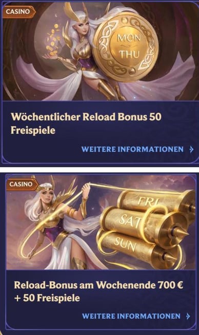 Wöchentlicher Reload Bonus | 50 Freispiele | 🟣 Mindesteinzahlung: 20 Euro 🟣 Gilt von Montag bis Donnerstag 🟣 Umsatzbedingungen: 40x 🟣 Gültig 10 Tage 🟣 Max. Einsatz: 5 Euro |