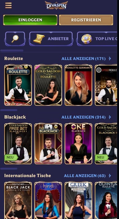 Im Live-Casino können Sie sowohl klassische Tischspiele wie Blackjack, Poker und Roulette als auch moderne Spielshows mit echten Dealern spielen.