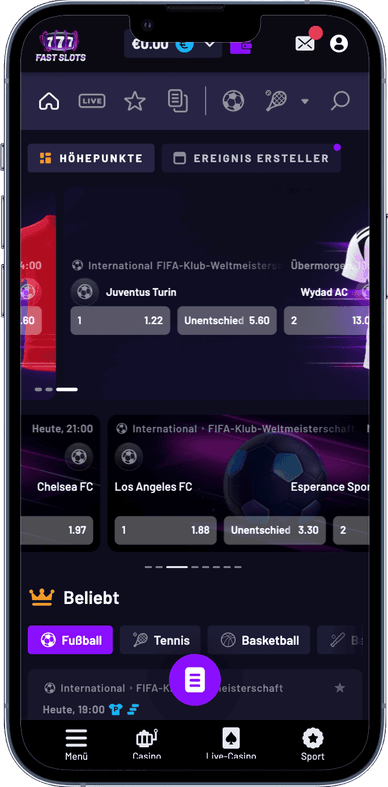 Klicken Sie oben auf der FastSlots-Startseite auf “Sport”, um ins Paradies für Sportfans zu geraten. Hier stehen Ihnen mehr als 45 Sportarten und 16 E-Sport-Disziplinen zur Verfügung. Die beliebtesten Sportarten sind Fußball, Tennis, Basketball, American Football und Eishockey.