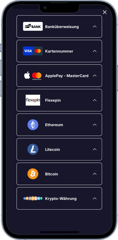 💶 Zahlungssysteme | Visa / Mastercard, Bank Überweisung, Apple Pay, mit Flexepin, Crypto (BTC, ETM, LTC) |