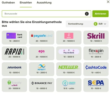 Dieses seriöse Online-Casino bietet verschiedene Zahlungsmöglichkeiten an, darunter auch Kryptowährungen, was ich für einen großen Vorteil halte. Die Zahlungsmethoden für DE und AT sind die gleichen.
