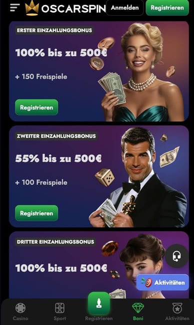 Das OscarSpin Handy-Casino bietet neuen Spielern einen Bonus für ihre erste Einzahlung an. Die Höhe des Bonus beträgt 100% der ersten Einzahlung (bis zu 500 €), sowie 150 Freispiele. Um diesen Bonus zu erhalten, müssen Sie die folgenden Bedingungen erfüllen: