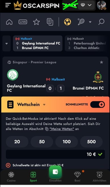 Neben den Spielautomaten bietet das Oscarspin Casino, das deutsche Spieler akzeptiert, auch einen Online-Sportwettenbereich. Hier finden Sie Sportereignisse in den beliebtesten Sportarten, auf die Sie sowohl vor dem Spiel als auch online eine Wette platzieren können. Es gibt 7 Sportarten, die auf der Website verfügbar sind, unter ihnen Fußball, Hockey und Tennis, die die beliebtesten sind.