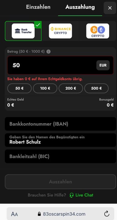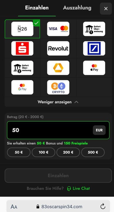 Um im Casino um echtes Geld spielen zu können, müssen Sie eine Einzahlung tätigen. Es ist sehr einfach, dies auf der Oscar Spin Casino Deutschland Website zu tun. Sie müssen dafür die folgenden Schritte erfüllen: