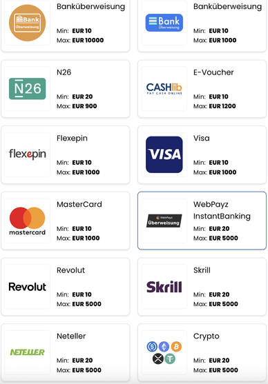 💶 Zahlungssysteme | Visa / Mastercard, Bank Überweisung, Bank Transfer Casino, WebPayz InstantBanking, Neteller, Skrill, №26, Cashlib, Revolut Online Casino, Sparkasse, Flexepin Bezahlen, Crypto (BTC, ETM, XRP, USDT, USDC) |