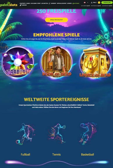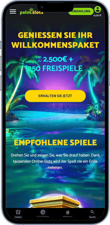 Der Gesamtbetrag des Palmslots Willkommenspakets liegt bei 300 % bonus bis zu 2.500 Euro und 250 Freispielen. Der Bonus steht allen neuen Spielern zur Verfügung, die eine Mindesteinzahlung von 20 Euro tätigen.