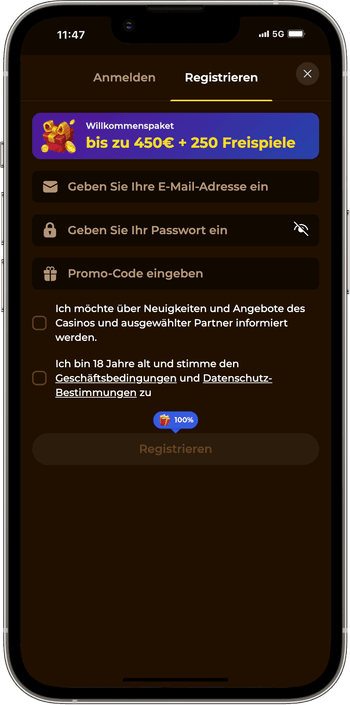 - Promo-Code (optional) eintippen. Man gebe ich bei Bedarf einen Promo-Code ein, um zusätzliche Boni zu aktivieren.