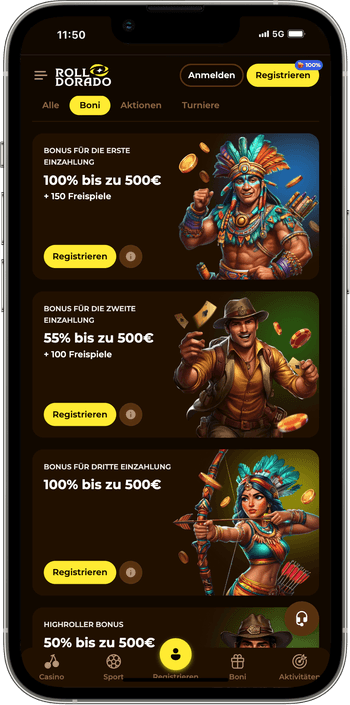 Ich habe recherchiert, dass die Seite für Sportwetten-Fans ein eigenes Willkommenspaket im Angebot hat. Es umfasst die ersten drei Einzahlungen. Neue Spieler bekommen bei der ersten Einzahlung einen 100 % Bonus bis zu 100 €. Die zweite Einzahlung löst einen 75 % Roll Dorado Bonus bis zu 150 € aus. Bei der dritten Einzahlung gibt es einen 50 % Bonus bis zu 200 €.