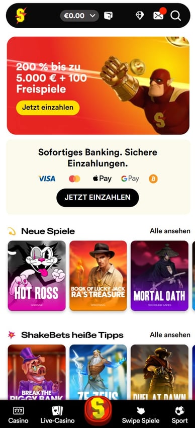 Das Ergebnis ist ein ShakeBet Casino App-ähnliches Erlebnis direkt aus dem Browser heraus, vollständig responsiv, mit flüssig ladenden Spielen, funktionsfähigen Kassenbereich und problemlos zugänglichen Bonusaktionen. Besonders die Swipe Games-Sektion ist für Mobilgeräte optimiert und ermöglicht ein Casino Online sofort-Spielerlebnis ohne Wartezeiten. Wer von unterwegs spielen möchte, ist mit der Shakebet PWA bestens ausgestattet.
