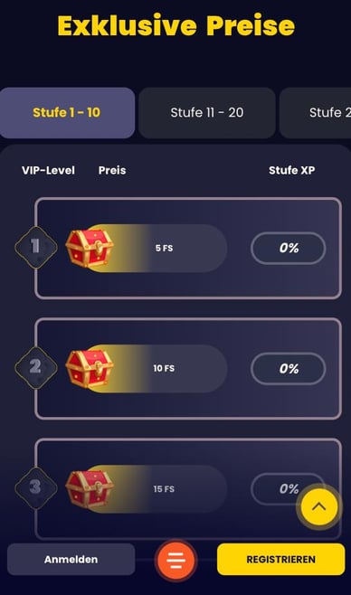 - 🥇 VIP-Stufe 1-10: 5 bis 50 Freispiele oder bis zu 5 EUR