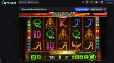 Zu Beginn des Spiels erhalten Sie einen bestimmten Betrag an virtuellem Geld und haben die Möglichkeit, einen Einsatz zu wählen. Ich habe einen der beliebtesten Spielautomaten in Deutschland gespielt, Book of Ra. Zu Beginn meines Testspiels hatte ich 1.000 € auf meinem Konto. Der maximale Einsatz, der in der kostenlosen Version des Spielautomaten platziert werden konnte, betrug 60, und der Mindesteinsatz pro Dreh betrug 0,20. Es gab auch die Möglichkeit, bei diesem Slot Boni zu kaufen. Ich habe diesen Slot im BetOnRed Casino gefunden, das deutsche Spieler akzeptiert.
