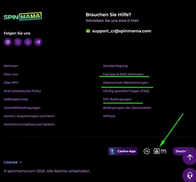 Das SpinMama Casino Deutschland erfordert im Rahmen des KYC-Verfahrens die Verifizierung des Kontos. Das bedeutet, dass es vom Spieler persönliche Dokumente anfordern kann, um seine Identität zu prüfen und Geldwäsche und möglichen Betrug zu vermeiden. Diese Anforderung gilt für deutsche Spieler für alle Auszahlungsmethoden und auch für Kryptozahlungen.