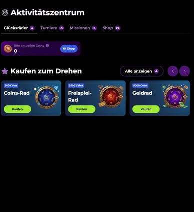 Im Bereich Missionen kann man verschiedene Aufgaben erfüllen und dafür Münzen verdienen. Beispiele der Aufgaben: erste Einzahlung tätigen, Telefonnummer verifizieren, mobile App installieren oder Wetten mit einem bestimmten Betrag platzieren.