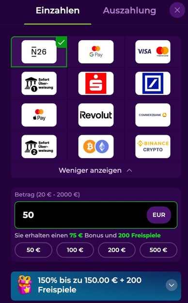 Um Ihr Konto aufzuladen, gehen Sie auf “Einzahlen” in Ihrem Profil. Im Fenster werden alle verfügbaren Zahlungsmethoden angezeigt. Wählen Sie die Methode aus und geben Sie den Betrag ein. Die Transaktionen werden sehr schnell und gebührenfrei abgewickelt, so dass Sie in ein paar Minuten spielen können.