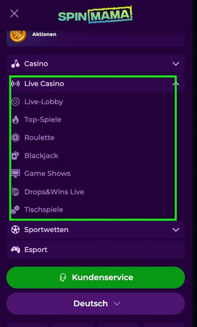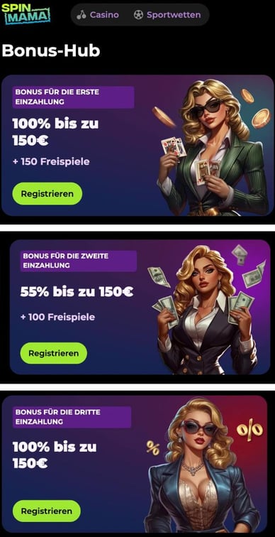 Detaillierte Informationen über Bonusbedingungen im Online Casino SpinMama finden Sie in der Rubrik “Konten, Auszahlungen und Boni” unten auf der offiziellen Website.