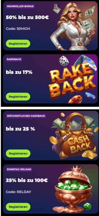 🎁 Boni und Promo | Willkommensbonus (Casino und Sport), Glücksräder, Turniere, Missionen, Shop, Treueprogramm, Cashback, Rakeback, High Roller Bonus, Einzahlungsbonus, Reload Bonus |