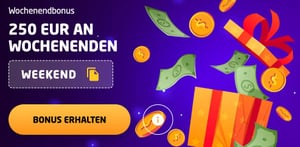 Wochenenbonus | 🔸 Jedes Wochenende haben die Spieler Zugang zu einem Reload-Bonus von 30 % bis zu 250 €. 🔸 Die Mindesteinzahlung beträgt 30 Euro. 🔸 Die Gültigkeitsdauer des Bonus beträgt 7 Tage. Promo Code: WEEKEND |