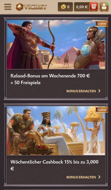 🎁 Wöchentlicher Cashback | 15 % bis zu 3.000 € | Abhängig vom Casino Vicibet VIP-Level, auf Wochenverluste |