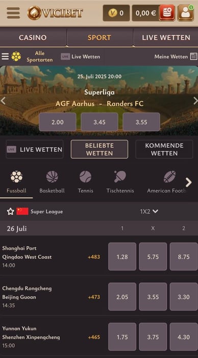 Bei meinen Tests stellte ich fest, dass Sportwetten-Sektion von Vicibet umfangreich ist und deckt über 25 Sportarten ab – darunter Fußball, Tennis, Basketball, Eishockey und mehr. Geboten werden Einzelwetten, Kombiwetten, Langzeitwetten und Spezialmärkte.