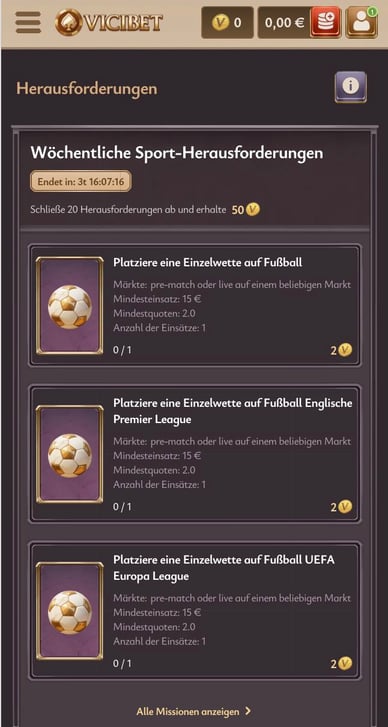 Die Einsätze beginnen meist bei 0,20 €. Je mehr du spielst, desto höher dein Rang und deine Belohnung. Im Sportbereich gibt es ergänzend Wett Challenges mit ähnlichem Punktesystem und Extra Quoten für aktive Tipper.