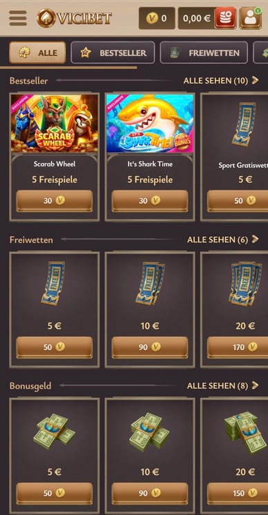 Im Vicibet Casino DE Shop kannst du gesammelte Bonuspunkte gegen Echtgeld oder Freispiele eintauschen. Diese Punkte erhältst du durch Echtgeldspiele, abgeschlossene Herausforderungen oder Turniere. Zum Beispiel kannst du 90 Punkte gegen 10 € Echtgeldguthaben tauschen. Weitere Optionen: 150 Punkte für 25 Freispiele oder 500 Punkte für 50 € Bonusgeld. Der Shop ist direkt im Benutzerkonto zugänglich und bietet eine clevere Möglichkeit, Spielaktivität zusätzlich zu belohnen.