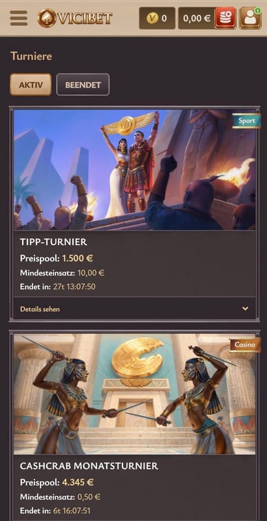 Die Turniersektion bei Vicibet Online Casino ist dynamisch aufgebaut und richtet sich sowohl an Slot-Spieler als auch an Fans von Bonusspielen. Die Preisgelder variieren je nach Event und reichen von wenigen Hundert bis über 50.000 Euro. Zu den Turnierkategorien gehören: