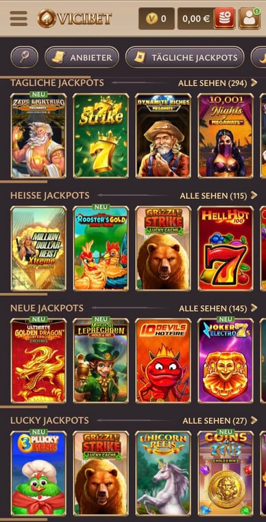 Die Jackpot-Sektion ist gut sortiert und einfach zu navigieren – perfekt für Vicibet Casino DE Spieler, die gezielt nach den größten Gewinnen suchen.