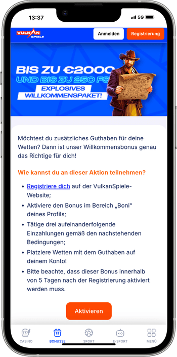 Jeder Bonus ist 5 Tage lang nach Erhalt verfügbar. Wettanforderungen: 40x für Bonusgeld, 30x für Freispiele.