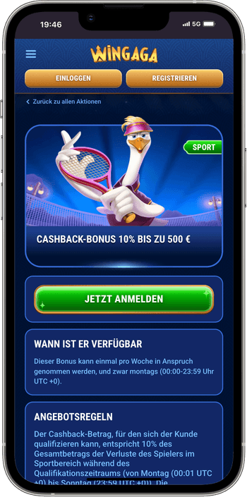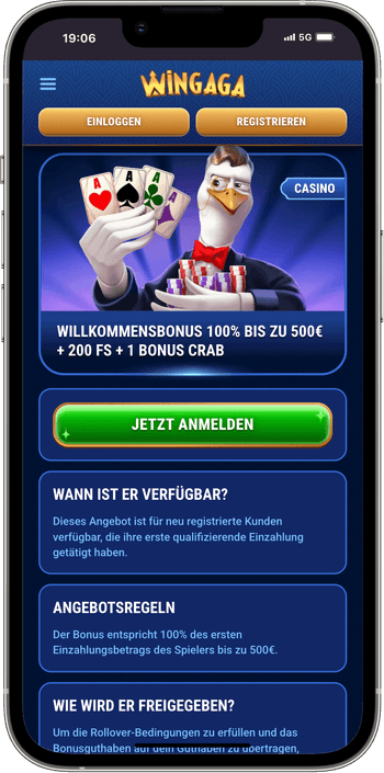 Bitte beachten: Für Spieler aus Deutschland gibt es Altersbeschränkungen. Sie können sich bei Wingaga erst ab 18 Jahren anmelden. Außerdem gibt es ein Verbot für Multiaccounts. Wenn mehr als ein Profil pro Benutzer entdeckt wird, werden alle gesperrt und die Gewinne werden storniert.