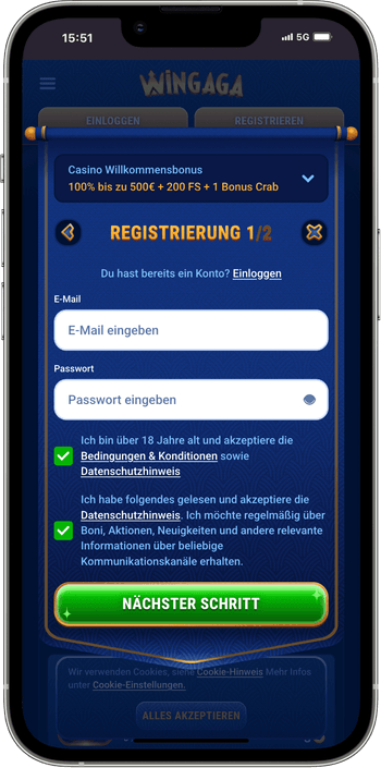 Die Registrierung im Wingaga Online Casino erfolgt in mehreren Schritten: